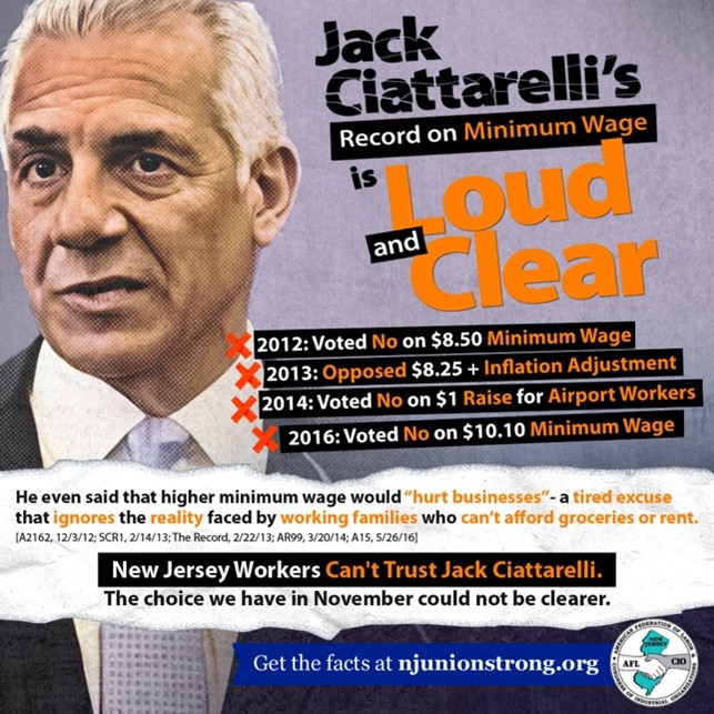 Again and again, Ciattarelli has turned his back on workers — fighting against fair wages and economic dignity. He may claim to support the middle class, but his record tells the real story: Jack Ciattarelli is on the wrong side of working people. [A2162, 12/3/12; SCR1, 2/14/13; The Record, 2/22/13; AR99, 3/20/14; A15, 5/26/16]